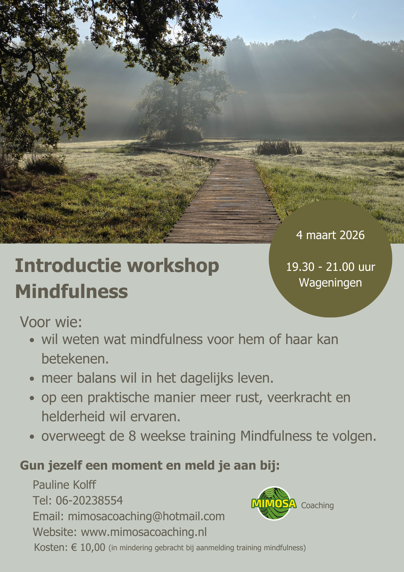 Op woensdagavond 4 maart 2026 is er een introductie workshop Mindfulness.